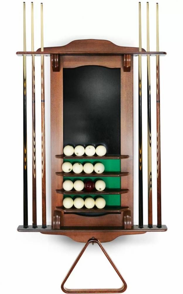 Модель настенная, предназначена для 6 киев, позволяет разместить треугольник, мелки, а также бильярдные шары. Материал сосна или массив ясеня. Есть возможность выбрать цвет из палитры Фабрики «Старт»