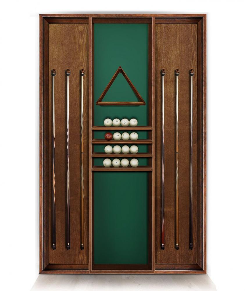 Модель рассчитана для хранения 6 киев на подвесе. Специальные полочки и держатель позволят также разместить шары и треугольник, что гарантирует их сохранность и легкий доступ во время игры.