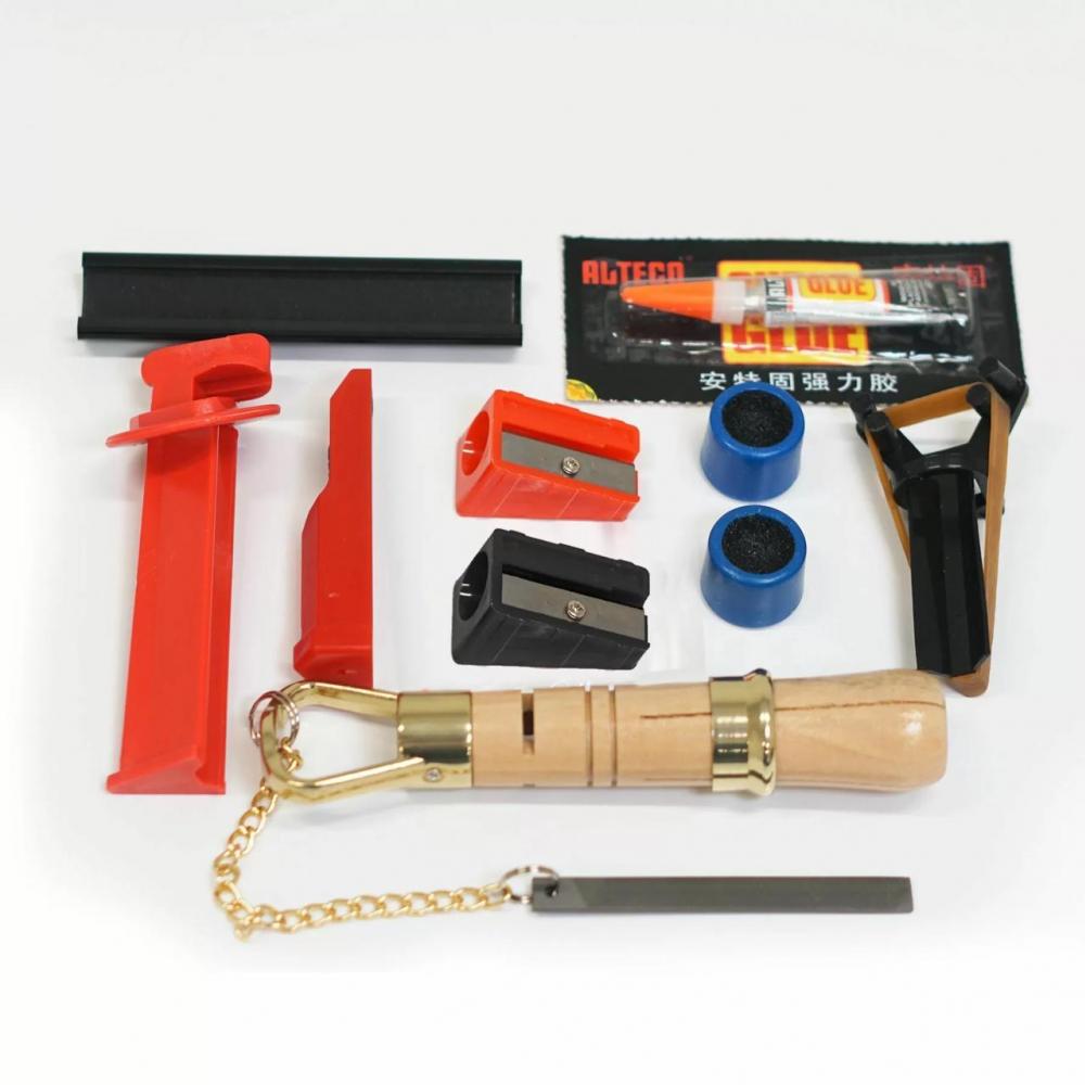 В данном наборе инструментов вы найдете все необходимое для установки наклейки на кий и поддержании ее в хорошем состоянии.